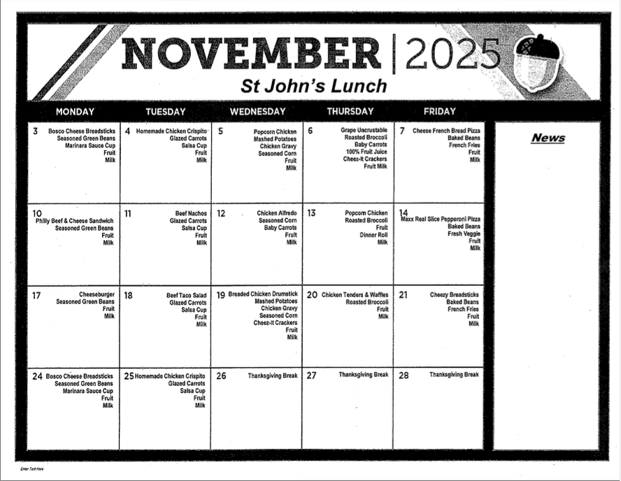 En la escuela San Juan Evangelista, nos enorgullece ofrecer un programa integral de almuerzo caliente, que garantiza que nuestros alumnos reciban comidas nutritivas y deliciosas a diario. Las familias pueden gestionar fácilmente la cuenta de almuerzo de sus hijos y consultar los menús a través de nuestro práctico sistema en línea.
