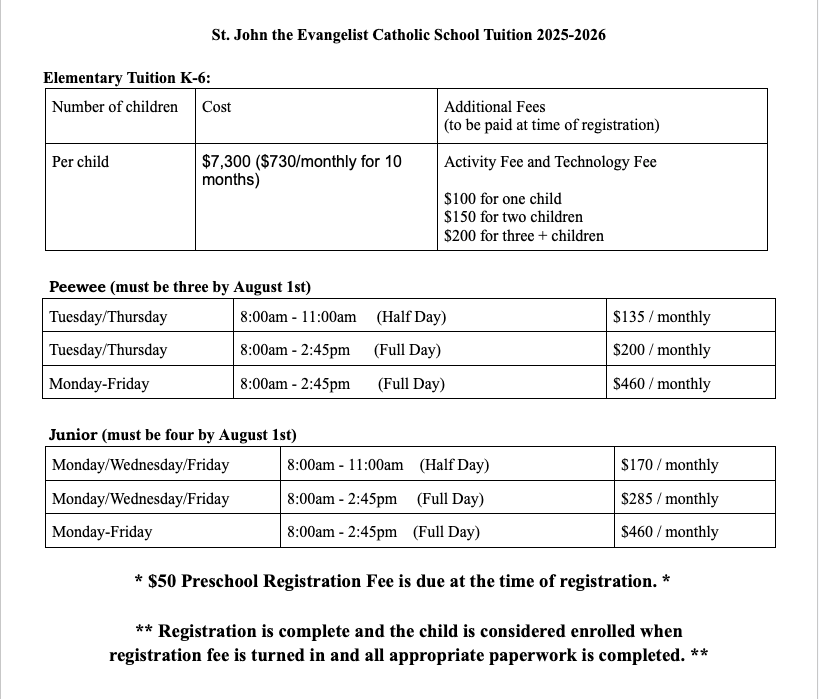 Tuition Rates are set annually based on the total cost to educate a child and available parish subsidy. FACTS Tuition Management Company is responsible for the online set-up of all tuition payment plans for St. John the Evangelist Catholic School. Families are required to pay tuition and fees using the FACTS system using this link https://online.factsmgt.com/signin/3XX8N.